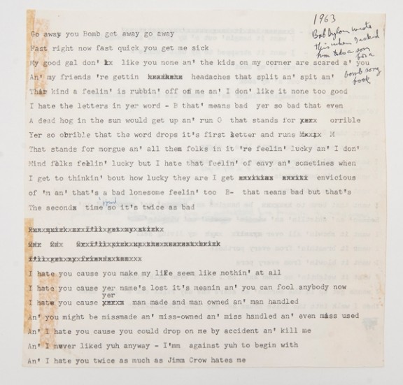 Go away you bomb get away go away. Fast right now fast quick you get me sick. Es el comienzo de una inédita letra de Bob Dylan que saldrá a subasta el próximo 26 de junio en la famosa casa Christie’s, que ha valorado el manuscrito en 30.000 euros. ‘Go away you bomb’ ha estado durante décadas oculta. Dylan la compuso en 1963 como un encargo para Izzy Young. La famosa estrella folk norteamericana buscaba letras contra el desarrollo nuclear en plena guerra fría con el desafío constante entre Estados Unidos y la Unión Soviética.