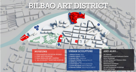 En este espacio se incluyen galerías de arte, libreros, anticuarios, casas de subasta y restauradores de prestigio, así como el Museo de Bellas Artes, el Museo Guggenheim Bilbao, el Museo Marítimo y la Sala Rekalde. Un entorno que reúne, además, esculturas al aire libre de los autores contemporáneos más representativos (Dalí, Chillida, Koons, Bourgeois, Kapoor) y una exhibición privilegiada de las obras más actuales de arquitectos como Pelli, Isozaki, Ferrater, Soriano, Siza, Moneo o Gehry.