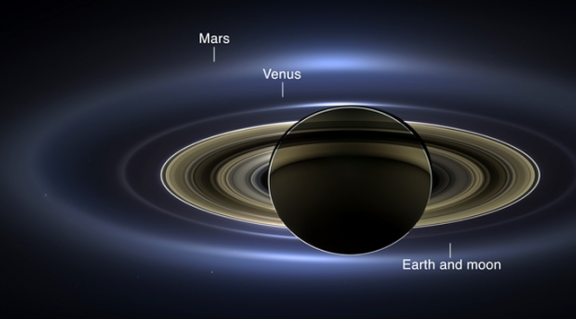 Situación: la Tierra es un brillante punto azul ubicado hacia el extremo inferior derecho de Saturno; Venus es un brillante punto que se localiza hacia el extremo superior izquierdo de Saturno; Marte también aparece, como un pálido punto rojo, por encima y hacia la izquierda de Venus. La escena de la imagen abarca unos 651,591 kilómetros, tan inmensa que la Tierra y la Luna entrarían en la distancia que hay entre el propio planeta y el segundo anillo exterior, el anillo E. El volumen de Saturno es unas 740 veces el de la Tierra.