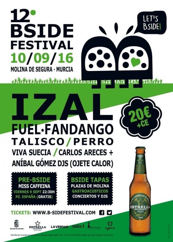 Bastante antes, desde el 10 de septiembre (a partir de las 20.00 horas), tendrá lugar la duodécima edición del B-Side Festival en Molina de Segura con un cartel que incluye a Izal, Fuel fandango, Talisco, Perro, Viva Suecia y los djs Carlos Areces y Aníbal Gómez (Ojete Calor). El precio de las entradas es de 20 euros anticipada, y 25 euros en taquilla. Antes de eso llegará el Pre B-Side con conciertos gratuitos el viernes 9 de septiembre. Durante el festival habrá autobuses gratuitos entre Molina de Segura y Murcia y viceversa, además de varias actividades paralelas como complemento del evento.