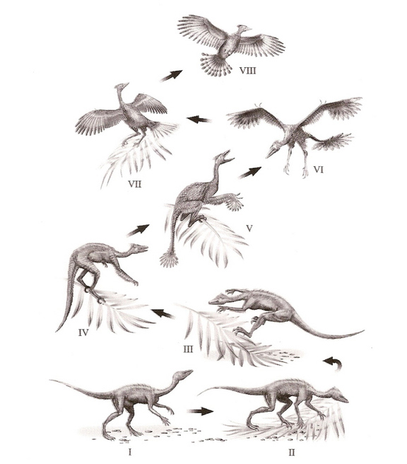 Resultado: se aceptó que después de la extinción, cuando sólo sobrevivieron las especies que no pesaban más de dos o tres kilogramos, este tipo de formas de vida de origen dinosaurio evolucionaron hacia lo que hoy son las aves, desde el pequeño colibrí hasta el gigantesco cóndor. En una primera fase habrían tenido cuatro alas para planeo, una por cada pata, para luego evolucionar mucho más las delanteras y las traseras reducirse y elevarse por debajo del cuerpo para poder usarse como garras. Aves y dinosaurios comparten huesos neumatizados, así como muchas otras características genéticas que establecen conexión entre ambos grupos. Se supone que fue durante el Jurásico cuando evolucionaron hacia un nuevo estado: perdieron los dientes, desarrollaron determinados músculos y atrofiaron otros, sus colas reptilianas se redujeron y también perdieron peso y tamaño para fomentar el vuelo.