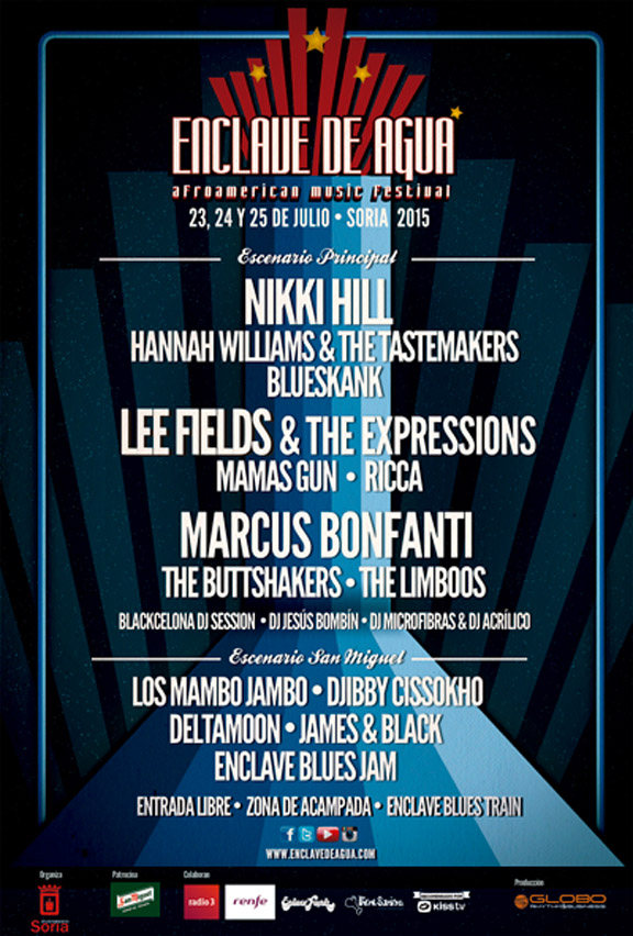 Enclave de Agua, festival dedicado a música de raíz afroamericana que se lleva a cabo en la ciudad de Soria desde el año 2008. La edición de este año (2325 de julio) será en el paraje de Soto Playa con 16 bandas en el cartel.
