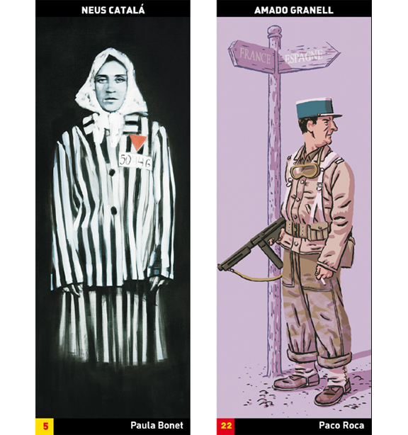 Sento Llobell, Juan Negrín;  Micharmut, Manuel Azaña; Max Vento, Giral José;  Ajubel, Max Aub; Paula Bonet, Neus Catalá; Luis Demano, Clara Campoamor; Nacho Casanova, Antonio Machado; Rafa Fonteriz, Josep Renau; Salvador Larroca, Rafael Alberti;  Martín López, Rodolfo Llopis; Sergi Bleda, Alejandra Soler; Carlos Ortín, Pedro Salinas; David de las Heras, Miguel Buiza;  Calpurnio, Ramón J. Sender; Juan Miguel Aguilera, Francisco Ayala; Nacho Lavernia, Constancia de la Mora; César Moragues, Ignacio Hidalgo de Cisneros;  Omega, Cipriano Mera; Maria Herreros, Dolores Ibarruri;  Malota, Antonio Cordón;  Manel Gimeno, Joan Pujol “Garbo”; Paco Roca, Amado Granell;  Calo, Guillermina Medrano; Mar Silvestre, Margarita Nelken;  Cento Yuste, Manuel Tuñón de Lara; Jordi Bayarri, María Teresa León; Paco Giménez, Margarita Xirgu;  Ortifus, Castelao;  Juan Almela, Federica Montseny; Jorge Parras, Largo Caballero; Cachete Jack, Juan García Oliver; Txemacantropus, Angelí Castanyer i Fons;  Cristina Durán, Josep Castanyer i Fons;  Esteban Hernández, José Puche Álvarez; Mique Beltrán, Luis Buñuel; Mik Varo, Araceli González Carballo.