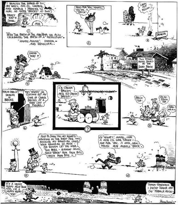 Este nuevo medio trajo consigo una serie de hallazgos visuales basados en la repetición de esquemas y patrones que ya en esta primera etapa tuvieron importantes logros narrativos. Su creación más popular fue la tira ‘Krazy Kat’ (1913-1944), considerada por la revista The Comics Journal como el mejor cómic del siglo pasado. La serie narra un triángulo amoroso que se repite incansablemente durante los más de treinta años que duró su publicación a través de un núcleo básico argumental: Ignatz, el ratón, arroja un ladrillo a la cabeza del gato Krazy, interpretando este la agresión como una declaración de amor, mientras el perro Offisa Pupp trata de evitar los ataques y encarcelar al ratón a modo de castigo.