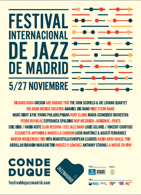 Voces y músicos antiguos y nuevos, muchas de ellas mujeres, 21 conciertos entre el auditorio del Conde Duque, uno en La Riviera y otro en el Instituto Francés, conferencias, cine y más de una treintena de actuaciones distribuidas en el programa “Sabor a club” de la asociación de salas de música de directo La Noche en Vivo. En el cartel destacan nombres cardinales dentro del género como John Scofield, Joe Lovano, Mike Stern, Oregon, Abdullah Ibrahim, Kurt Elling, Rabih Abou Khalil, Louis Sclavis, Vincent Courtois, Marc Ribot, Eric Bibb, Kabib Koite, Marcin Wasilewski, Anthony Strong o Richard Bona, encargado de inaugurar el festival.