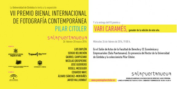 En paralelo se presenta la exposición del VII Premio Bienal Internacional de Fotografía Contemporánea Pilar Citoler (2012-2013), un galardón de vocación contemporánea, realizándose una cuidada monografía bilingüe, dentro de la colección ‘El Ojo que ves’. Este año, coincidiendo con la exposición del Premio, se ha publicado su sexto volumen, tras editar los dedicados a los anteriores ganadores, Begoña Zubero (2007), Félix Curto (2008), Manuel Sonseca (2009), Juan del Junco (2010) y Karen Knorr (2011). A la par que la exposición en la Sala PuertaNueva, se presenta esta monografía que analiza el quehacer de Jorge Yeregui, escrita por Joan Colom, Alberto Martín y Alfonso de la Torre. El ganador del VII Premio fue Vari Caramés, representado por su obra ‘Bam Bam’, su trabajo supone un verdadero reto sobre el mundo de las apariencias y su fatua consideración de “realidad”.