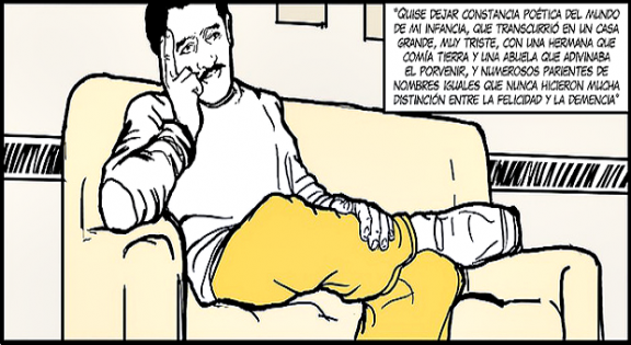 Arranca desde que él era muy pequeño, contando toda su infancia en un pueblo colombiano y su relación con personas que lo incitaron desarrollar su mundo imaginativo y literario. La experiencia visual lleva hacia partes muy concretas de su vida, como cuando escribía ‘Cien años de soledad’. Lo más importante es que la historieta trata de mostrar la pasión por la literatura de García Márquez, a pesar de los obstáculos en su vida. Por ejemplo, Gabo estudió Derecho solo para complacer a su familia, pero a escondidas trabajaba en un diario; y cuando viajó a París tuvo que recoger basura y ahorrar dinero para poder comer. Aún así él siguió escribiendo.