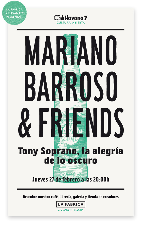El próximo jueves 27 de febrero (20.00 horas, Alameda 9, Madrid), dentro de las actividades del Club Havana 7 Cultura Abierta y de la mano de Teresa de Rosendo, el director y guionista de cine Marian Barroso charlara en mesa redonda sobre la influencia de ‘Los Soprano’ en la ficción televisiva y cinematográfica, incluso en la cultura popular de este arranque de siglo. La idea de la organizadora, La Fábrica, es iniciar una ronda de estas charlas-conferencia a partir de un invitado que elegirá una serie de ficción en concreto.