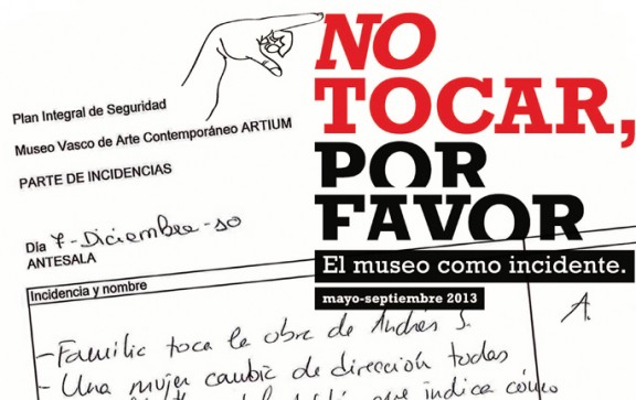 Mantener una distancia prudente frente a una obra de arte es un gesto asumido por la gran mayoría de visitantes en un museo; la exposición ‘No tocar, por favor’ en el museo Artium de Vitoria (17 de mayo – 1 de septiembre) parte del minucioso registro de incidencias en las salas de exposición de Artium, recogido por el personal del museo desde su creación en 2002.