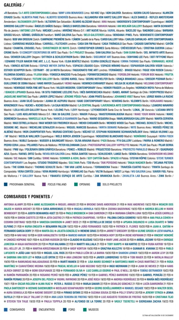En total habrá más de 150 especialistas entre invitados, asesores y conferenciantes y una larga miríada de galerías. Con Finlandia en el punto de mira. En el caso del país nórdico el listado final se reduce a 11 de las 70 galerías que existen en Finlandia (muchas de ellas autogestionadas por artistas), una gran representación elegida por el comisario Leevi Haapala (Museo Kiasma de Helsinki). En paralelo los artistas finlandeses tendrán presencia en Madrid a través de las exposiciones y colaboraciones que harán con los principales museos e instituciones de la capital dentro un proyecto en el que colaborarán la fundación finlandesa Frame y la embajada de ese país.