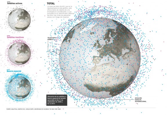 Otra imagen peor: trozos más grandes de una misión anterior se dirigen a la ISS (la Estación Espacial Internacional) y la alcanzan provocando desperfectos muy graves y poniendo en riesgo las vidas de la tripulación permanente de la estación. No sólo es dinero, son vidas humanas. Y cada situación similar es un peligro acumulado que se cierne sobre cada misión espacial. No hay que olvidar que cada sonda o lanzamiento de las agencias espaciales tienen que atravesar esa maraña metálica que da vueltas y vueltas sin cesar a nuestro alrededor. En muchos casos se trata de satélites de comunicaciones o militares obsoletos o inactivos porque, tecnológicamente, han muerto. Incluso una tuerca de un centímetro podría golpear con la fuerza de una granada de mano. Es el verdadero problema del que ya hablamos en 2011.