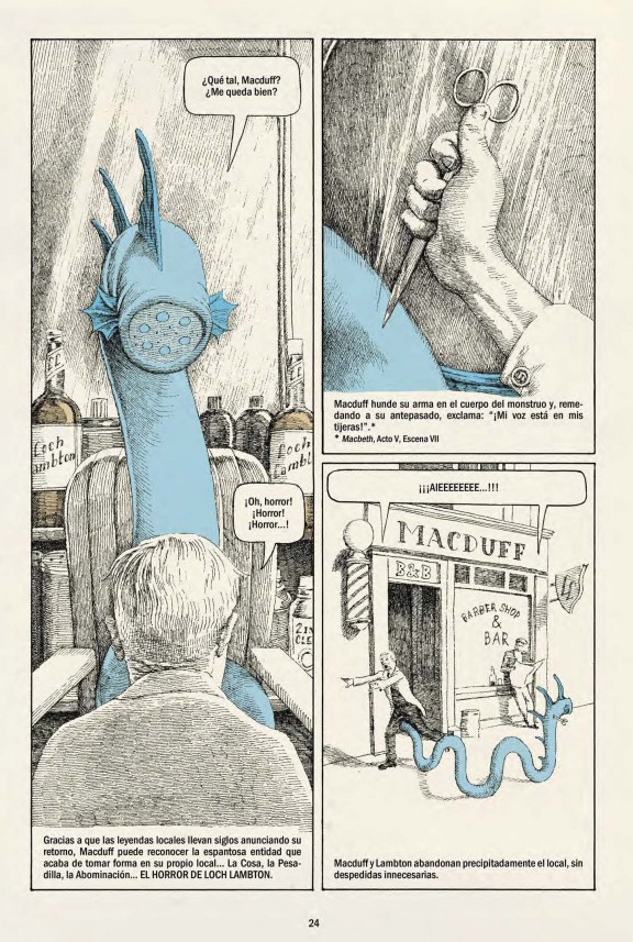 El eje de los tres es muy clara: un ser extraño, fuera del mundo, divergente por completo, que rompe la realidad habitual, ya sea Nueva York o Escocia. Cada uno de ellos se vincula a un color (rosa, azul y verde) que destaca con fuerza del blanco sepia y el negro de toda la trama. El mundo parece un grabado en blanco y negro con aire de grabado clásico donde el cómic auténtico rompe en forma de monstruo irreal que se hace textura y rompe con la tradición por contraposición. Esto provoca un choque de universos entre lo que consideramos verídico y lo que a todas luces es una pura invención que, al romper lo esperado, genera en el lector asombro. Es el mismo mecanismo de la literatura fantástica cuando se entreteje con la realidad, un género muy explotado en el cómic y la novela de ciencia-ficción pero aquí a partir de referencias muy personales de Sáez Castán.