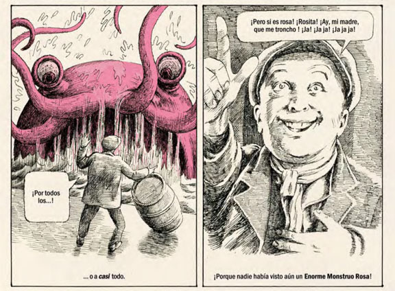 Pero no sólo es el débil tejido entre lo real y lo irreal, también está de fondo la marginación social y el lugar que ocupamos como individuos en una sociedad. El monstruo es un marginado, y Sáez Castán utiliza la figura para definir a ese extraño de una manera muy simbólica. El lector puede incluso llegar a identificarse con ese personaje que es totalmente irreal: una lamprea gigantesca de color azul que está en paro y se avergüenza de ello frente a las risas de los demás; o una babosa rosa que no quiere que nadie se ría de su color y que sólo aspira a destruir ciudades y comer gente con tranquilidad, y mucha dignidad. Incluso un marciano adaptado a la Tierra que decide luchar contra su propia gente para salvar su nueva vida. Todo como una consecuencia más de la narración del autor, que hila muy fino, no se dedica a explicarlo todo y deja que sea la imaginación del que lee y ve quien haga las asociaciones. ‘Extraños’ se convierte así en una obra diferente, peculiar, distinta a todo lo que se suele hacer y pura fantasía cargada de simbolismo.
