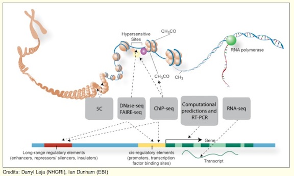 Los 30 estudios que ahora se publican están englobados dentro del proyecto ENCODE, iniciado en 2003, acrónimo en inglés de Enciclopedia de los elementos del ADN, y han sido realizados en 32 laboratorios de diferentes países entre los que se incluyen el Centro de Regulación Genómica en Barcelona y el Centro Nacional de Investigaciones Oncológicas (CNIO) en Madrid. La investigación cuenta con una inversión de más de 185 millones de dólares (146,6 millones de euros), recoge el relevo del Proyecto Genoma Humano que hace más de una década logró secuenciar el ADN de los seres humanos. A día de hoy, ENCODE ha recolectado tantos elementos que si se imprimiesen sobre un mural, éste mediría hasta 16 metros de alto y 30 kilómetros de largo, y que, en términos de capacidad, suman cerca de 15 terabytes de información en bruto, un “auténtico festín de datos genéticos”, disponibles públicamente en internet.
