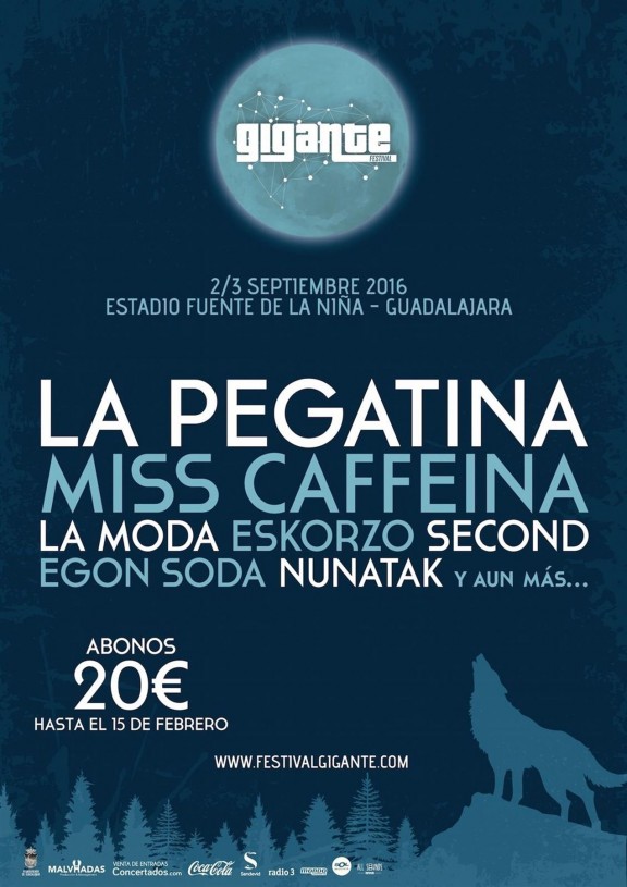 La Pegatina, Second, Miss Caffeina, Eskorzo, La Maravillosa Orquesta del Alcohol (La M.O.D.A.), Egon Soda y Nunatak son los primeros nombres confirmados del cartel de la edición de este año del Festival Gigante, que celebrará su tercera edición el 2 y 3 de septiembre en las pistas de atletismo Fuentes de la Niña de Guadalajara. Más adelante habrá muchas más confirmaciones porque el cartel apenas acaba de empezar a desgranarse, pero los abonos ya están a la venta en concertados.com por un precio promocional de 20 euros hasta el próximo 15 de febrero.
